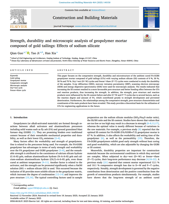 近日,我校建筑凯发郭乾博士作为第一作者,凯发k8官网作为第一署名单位,在国际权威期刊《Construction and Building Materials》上发表题为“Strength, durability and microscopic analysis of geopolymer mortar composed of gold tailings: Effects of sodium silicate”的学术论文。该期刊是中科院工程技术领域一区TOP期刊,当前影响因子为8.0。
